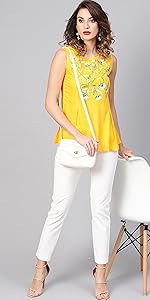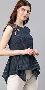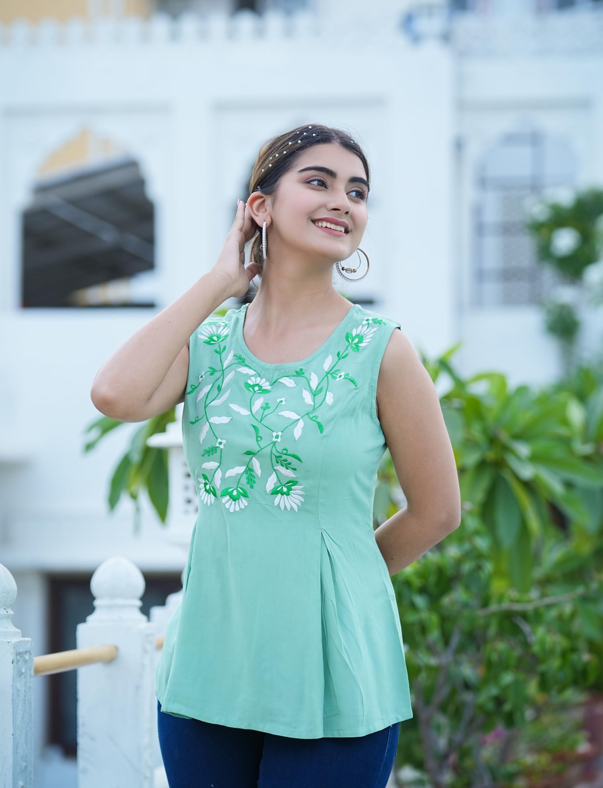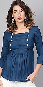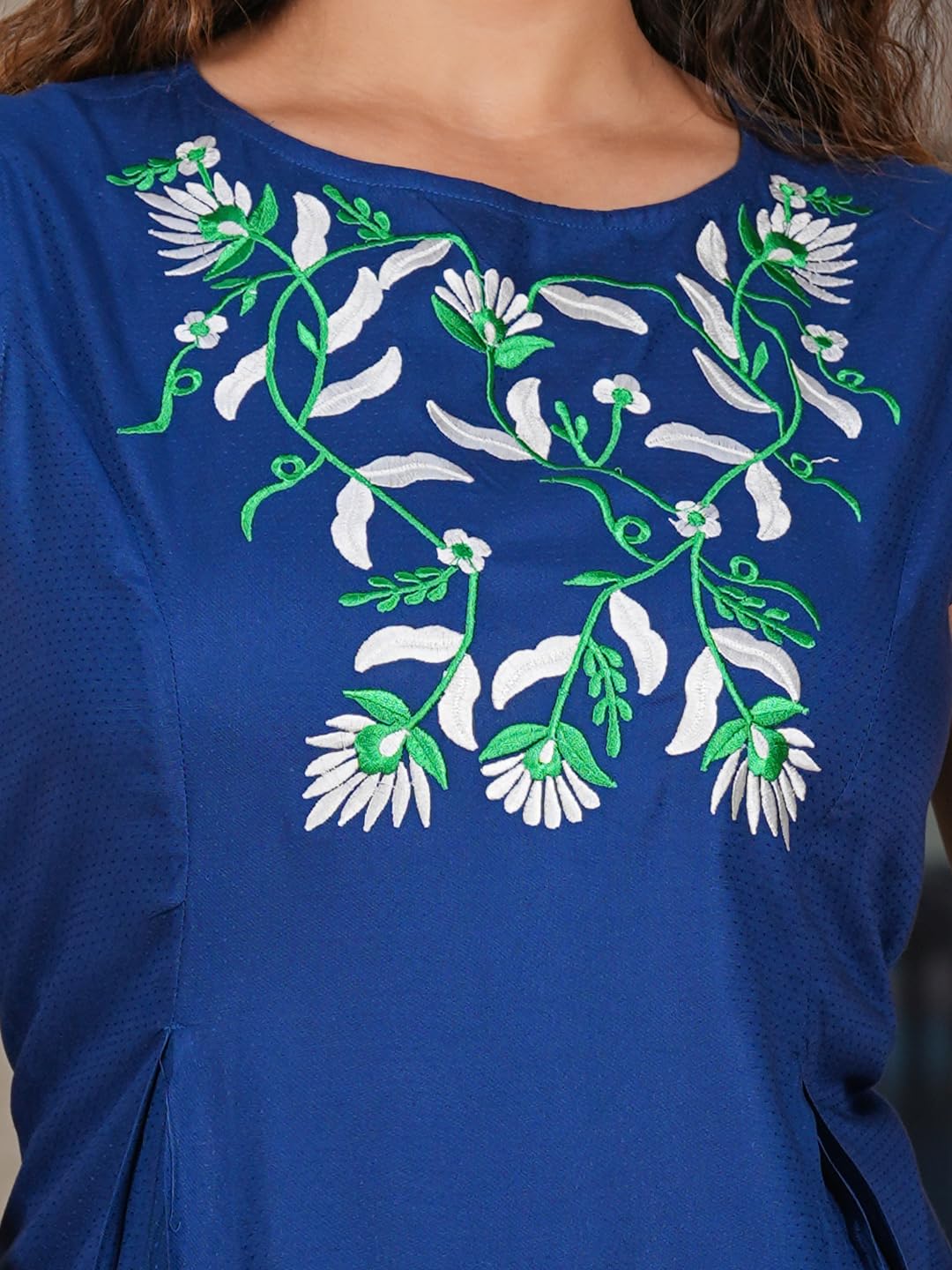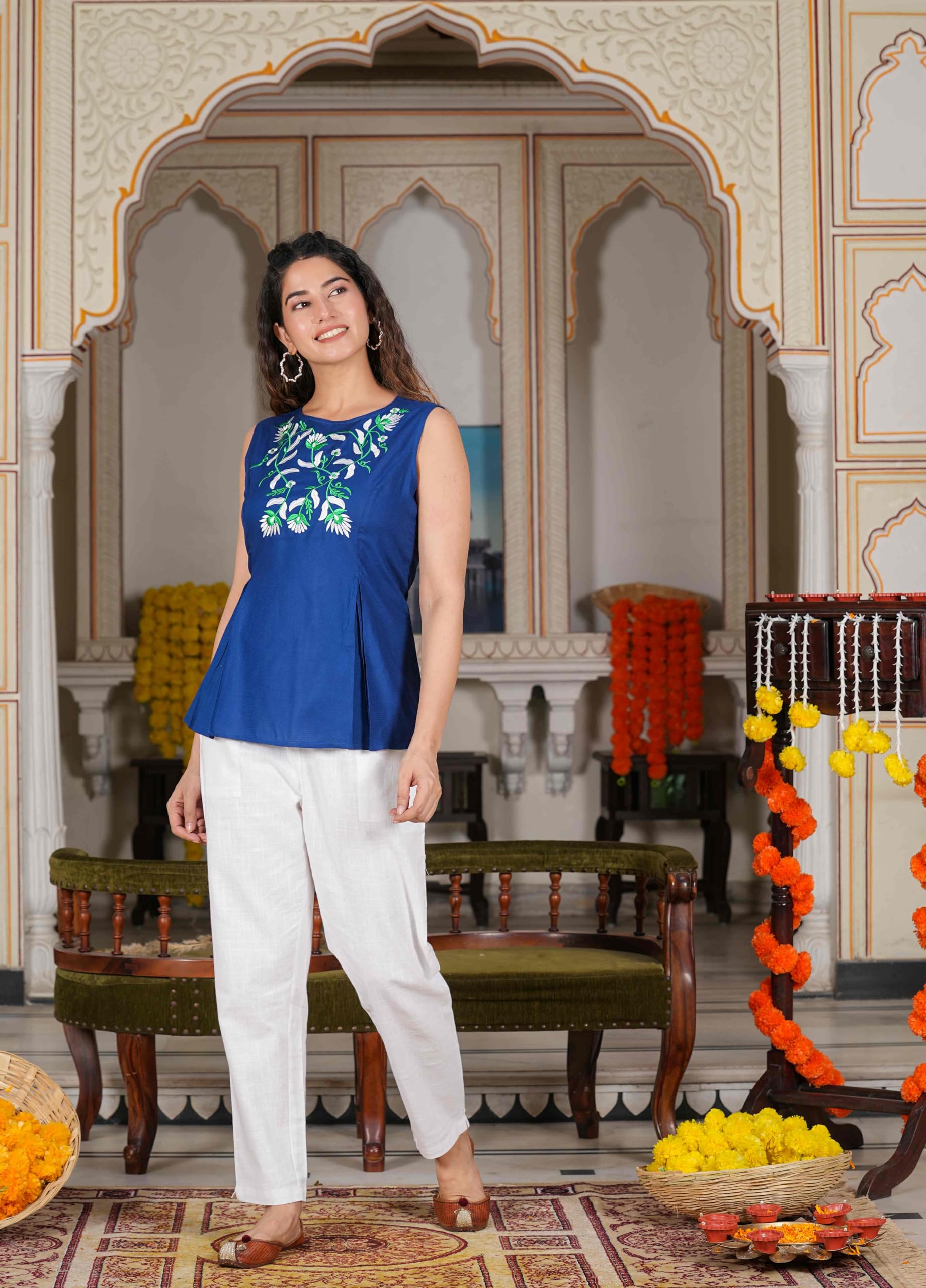 An amazing range of Women Western Wear in soft and solid colors that looks perfect for regular wear. With beautiful designs and patterns. These apparels are very stylish and comfortable too. Get rid of the 'regular' look this season wearing Top by YASH GALLERY. With a perfect blend of comfort and traditional style, This Blue Embroidered Regular Top from YASH GALLERY exhibits Embroidery on yoke Along with Round Neck and Sleeveless. Tailored from Rayon. Length: 26 Inches.