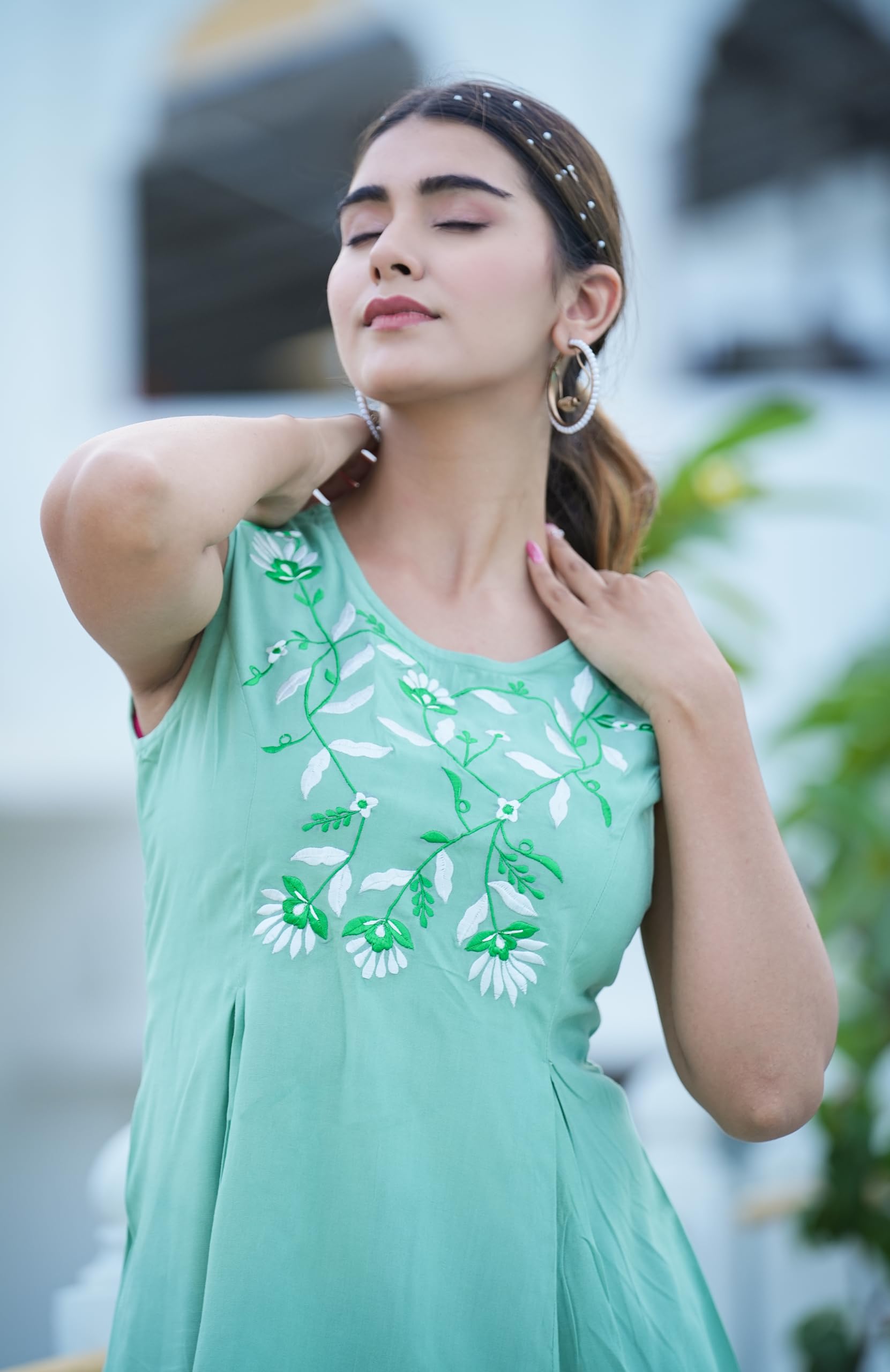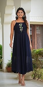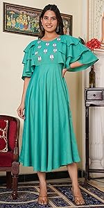 Yash Gallery Women's Rayon Embroidered Ankle Length Flared Dress For Women